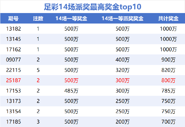 值得一提的足彩注万是,本期足彩派奖头奖多达800万,派奖是足彩玩法派奖奖金第6高的奖金,此前最高派奖奖金分别是第13182期、第13145期和第17162期开出1000万派奖奖金。
