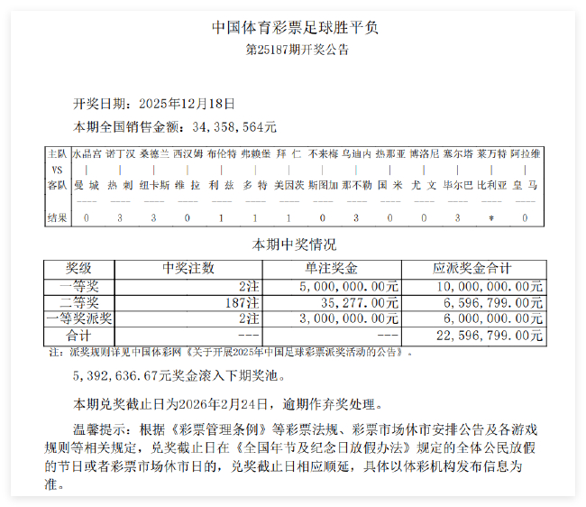 官网截图:莱万特vs比利亚雷因天气原因推迟北京时间12月18日,胜负彩第25187期开奖结果揭晓。足彩派奖头奖开出2注,单注奖金500万元,本期600万派奖奖金全部派完,每注多得300万元,单注共计8